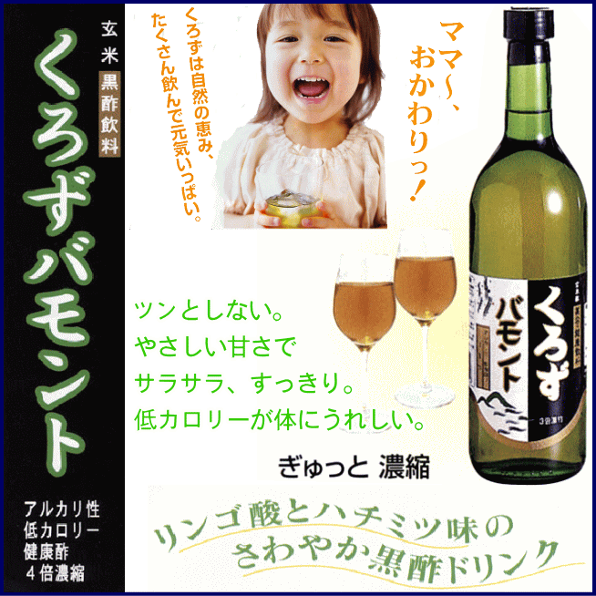 くろずバモント(清涼飲料水)6本組 名称 くろずバモント(清涼飲料水)4倍濃縮 原材料 玄米黒酢・りんご酢米酢・りんご酸・ハチミツ・クロレラ クエン酸・果糖・ステビア(甘味料)・黒糖等 内容量 720ml. 栄養成分表示(1食30g当たり) 熱量33,3kcl 糖質8,46g たんぱく質0,03g ナトリウム56,4 g脂質0,03g お酢が血液をサラサラにしてくれることはよく知られておりますが、 なかでも 黒酢の効果は素晴らしいものです 黒酢には、アミノ酸やクエン酸が豊富に含まれています 黒酢バモント極には、17種類以上のアミノ酸がたっぷり含まれていて、このアミノ酸は脂肪の合成を阻害し、脂肪の吸収を抑えて、脂肪の燃焼を促進させるはたらきがありますので、ダイエットにも最適です。 また、アミノ酸はコラーゲンの主成分であるたんぱく質の合成を促し、体細胞の新陳代謝を活発にするため、お肌の衰えるスピードを抑えることで美肌効果も得られます また、黒酢に豊富に含まれるクエン酸は、乳酸を分解してエネルギーに変換させるため、疲労回復にも大変効果があります また、黒酢には大腸のはたらきを活発にし、腸内環境を整える効果がありますので、便秘予防にも大変効果的です こんな方はぜひお試しください ■ドロドロの血液が気になる ■なかなか疲れがとれない■お肉やフライが大好き■ダイエットがうまくいかない くろずバモントは、冷水、またはお湯わり、豆乳やヨーグルトに混ぜても美味しくいただけます。 色々なお料理にも使えますので、ぜひお試しください