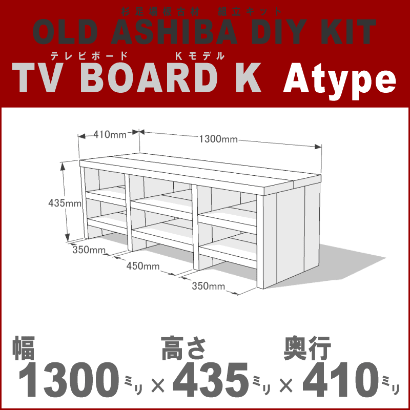トップページ > OLD ASHIBA > DIYキット テレビボード > Aタイプ 幅1300mm ※この商品には「BRIWAX(ブライワックス)」は付属していません。 >>BRIWAX(ブライワックス)販売ページはこちら 組立 必要(DIY初心者?中級者向け) >>店長くりすのテレビボード組立レポート ※「テレビボード(Kモデル)Aタイプ幅1500mm」を組立例とした説明書です。 説明書01 説明書02 説明書03 説明書04 完成図面と棚板変更について 組立に 必要な 道具 ・ 電動ドライバー(必須) ・ ハンマー(ダボ栓を打ち込むために必要) ・ のこぎり(ダボ栓をカットするために必要) ※ 別売の BRIWAX(ブライワックス) を塗る場合は、スポンジ(ワックスを擦り込む)と布(ワックスをふき取る)も必要です。 DIY キット 内容 ・ OLD ASHIBAフリー板 厚み35ミリ 無塗装 A)天板部材、B)棚板部材、C)脚部材(縦部材) ※ テレビボード用のキット部材のため、「B)棚板部材」「C)脚部材(縦部材)」の木口(長さ方向の断面)の仕上げはバリ取り程度で、サンディング仕上げは行っていません。 ※ 棚板の極端な段違いを防ぐため、「A)天板部材」「B)棚板部材」は、裏面を削って厚みを揃えている場合があります。 ・ ビス(フレキ付き) 65ミリ ・ ダボ栓 ※半分にカットして使えるので数はビスの約半分です ・ サンドペーパー(やや粗め) ※50cm分 ・ 組み立て説明書(上の「説明書01?04」と同じ)