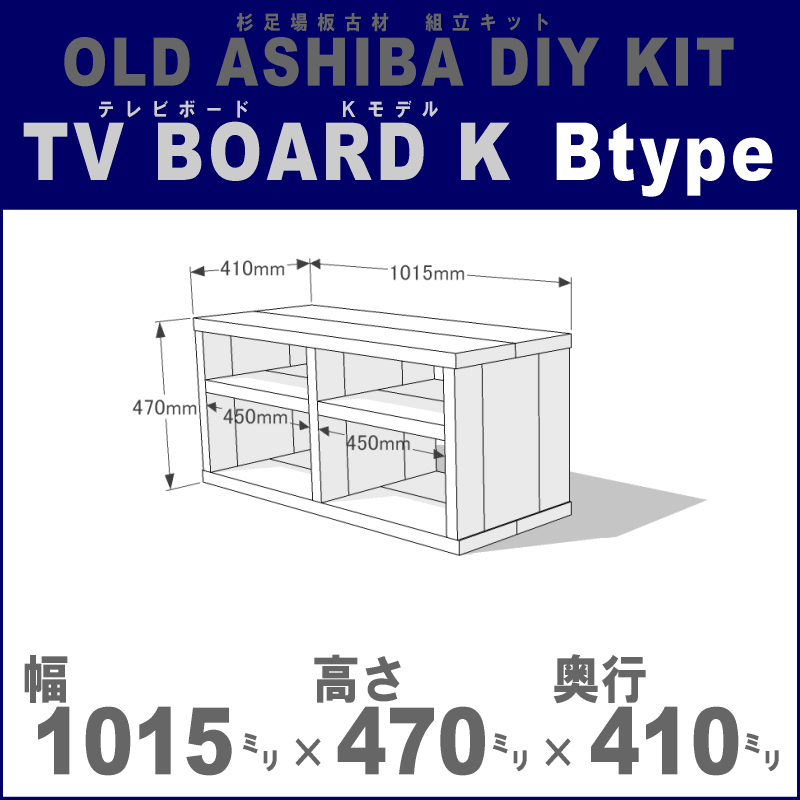 トップページ > OLD ASHIBA > DIYキット テレビボード > Bタイプ 幅1015mm ※この商品には「BRIWAX(ブライワックス)」は付属していません。 >>BRIWAX(ブライワックス)販売ページはこちら 組立 必要(DIY初心者?中級者向け) >>店長くりすのテレビボード組立レポート ※「テレビボード(Kモデル)Aタイプ幅1500mm」を組立例とした説明書です。 説明書01 説明書02 説明書03 説明書04 完成図面と棚板変更について 組立に 必要な 道具 ・ 電動ドライバー(必須) ・ ハンマー(ダボ栓を打ち込むために必要) ・ のこぎり(ダボ栓をカットするために必要) ※ 別売の BRIWAX(ブライワックス) を塗る場合は、スポンジ(ワックスを擦り込む)と布(ワックスをふき取る)も必要です。 DIY キット 内容 ・ OLD ASHIBAフリー板 厚み35ミリ 無塗装 A)天板部材、B)棚板部材、C)脚部材(縦部材) ※ テレビボード用のキット部材のため、「B)棚板部材」「C)脚部材(縦部材)」の木口(長さ方向の断面)の仕上げはバリ取り程度で、サンディング仕上げは行っていません。 ※ 棚板の極端な段違いを防ぐため、「A)天板部材」「B)棚板部材」は、裏面を削って厚みを揃えている場合があります。 ・ ビス(フレキ付き) 65ミリ ・ ダボ栓 ※半分にカットして使えるので数はビスの約半分です ・ サンドペーパー(やや粗め) ※50cm分 ・ 組み立て説明書(上の「説明書01?04」と同じ)