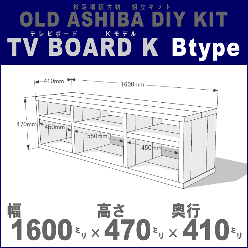 トップページ > OLD ASHIBA > DIYキット テレビボード > Bタイプ 幅1600mm ※この商品には「BRIWAX(ブライワックス)」は付属していません。 >>BRIWAX(ブライワックス)販売ページはこちら 組立 必要(DIY初心者?中級者向け) >>店長くりすのテレビボード組立レポート ※「テレビボード(Kモデル)Aタイプ幅1500mm」を組立例とした説明書です。 説明書01 説明書02 説明書03 説明書04 完成図面と棚板変更について 組立に 必要な 道具 ・ 電動ドライバー(必須) ・ ハンマー(ダボ栓を打ち込むために必要) ・ のこぎり(ダボ栓をカットするために必要) ※ 別売の BRIWAX(ブライワックス) を塗る場合は、スポンジ(ワックスを擦り込む)と布(ワックスをふき取る)も必要です。 DIY キット 内容 ・ OLD ASHIBAフリー板 厚み35ミリ 無塗装 A)天板部材、B)棚板部材、C)脚部材(縦部材) ※ テレビボード用のキット部材のため、「B)棚板部材」「C)脚部材(縦部材)」の木口(長さ方向の断面)の仕上げはバリ取り程度で、サンディング仕上げは行っていません。 ※ 棚板の極端な段違いを防ぐため、「A)天板部材」「B)棚板部材」は、裏面を削って厚みを揃えている場合があります。 ・ ビス(フレキ付き) 65ミリ ・ ダボ栓 ※半分にカットして使えるので数はビスの約半分です ・ サンドペーパー(やや粗め) ※50cm分 ・ 組み立て説明書(上の「説明書01?04」と同じ)