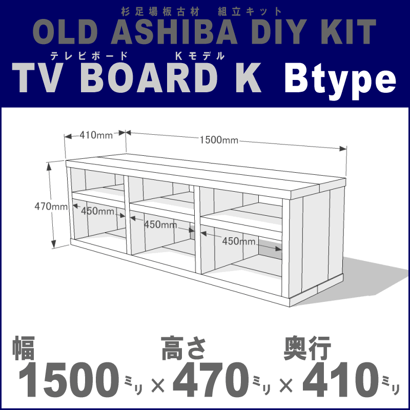 トップページ > OLD ASHIBA > DIYキット テレビボード > Bタイプ 幅1500mm ※この商品には「BRIWAX(ブライワックス)」は付属していません。 >>BRIWAX(ブライワックス)販売ページはこちら 組立 必要(DIY初心者?中級者向け) >>店長くりすのテレビボード組立レポート ※「テレビボード(Kモデル)Aタイプ幅1500mm」を組立例とした説明書です。 説明書01 説明書02 説明書03 説明書04 完成図面と棚板変更について 組立に 必要な 道具 ・ 電動ドライバー(必須) ・ ハンマー(ダボ栓を打ち込むために必要) ・ のこぎり(ダボ栓をカットするために必要) ※ 別売の BRIWAX(ブライワックス) を塗る場合は、スポンジ(ワックスを擦り込む)と布(ワックスをふき取る)も必要です。 DIY キット 内容 ・ OLD ASHIBAフリー板 厚み35ミリ 無塗装 A)天板部材、B)棚板部材、C)脚部材(縦部材) ※ テレビボード用のキット部材のため、「B)棚板部材」「C)脚部材(縦部材)」の木口(長さ方向の断面)の仕上げはバリ取り程度で、サンディング仕上げは行っていません。 ※ 棚板の極端な段違いを防ぐため、「A)天板部材」「B)棚板部材」は、裏面を削って厚みを揃えている場合があります。 ・ ビス(フレキ付き) 65ミリ ・ ダボ栓 ※半分にカットして使えるので数はビスの約半分です ・ サンドペーパー(やや粗め) ※50cm分 ・ 組み立て説明書(上の「説明書01?04」と同じ)