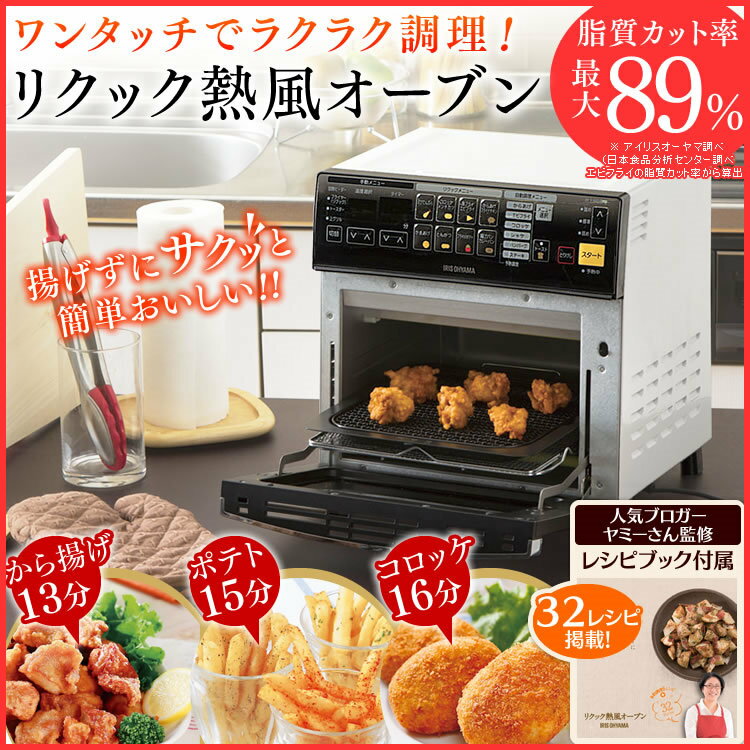 強い熱風で食材をムラなく加熱! 油を使わずに揚げ物料理をすることができます。 惣菜を温めなおすための「Re;cook(リクック)」機能を搭載! 業界先駈け!フライヤーにオーブン/トースター機能! 1:油を使わずにカンタン・ヘルシーな揚げものが作れる! 食材を加熱して水分を蒸発させ、油を使わなくても揚げ物のサクッとした食感を実現☆ また、熱せられた空気は庫内を循環します。 上下のヒーターからも食材に熱が加えられることで、庫内の温度を一定に保ち食材をムラなく加熱。 料理がヘルシーに仕上がります♪ また、廃油の手間も省けて、調理時間の短縮ができます。 ※パン粉を使用する食材や油分の少ない食材も、付属のオイルスプレーを使用することにより少ない油でおいしい調理が可能です☆ 2:揚げたてのおいしさを再現する、Re;cook(リクック)機能 高速熱風で加熱することによって、揚げたてのおいしさを再現!! 惣菜(揚げ物)を温めなおすための専用の機能です。 3:業界先駈け!フライヤーにオーブン/トースター機能を搭載! トーストやピザ、グラタンなどの調理が可能なトースター機能を搭載。 広い庫内で、4枚のトーストを一度に焼くことができます♪●商品サイズ(cm) 本体:幅約34.1×奥行き約32.5×高さ約34.8 フライヤー/リクック:幅約22×奥行約22×高さ約7 オーブン/トースター:幅約25×奥行約25×高さ約8 ●重量:約9.8kg ●消費電力:1410W ●電源:AC100V(50/60Hz共通) ●ヒーター フライヤー/リクック:シーズヒーター×1 オーブン/トースター:石英管ヒーター×4(上下各2) ●コード長さ:約1.2m ●材質 外装:鋼板(粉体塗装)、ガラス、ポリアミド、その他 内装:メッキ鋼板、網:鉄線(メッキ)、受け皿:メッキ鋼板 ●付属品:フライ受け皿、フライ用網、オイルスプレー、レシピブック、オイルスプレー ●型番:FVX-M3A-W■■ 当店一押しのノンフライヤー ■■ 商品名 ノンフライ熱風オーブン コンンべクションオーブン リクック熱風オーブン ノンフライオーブン 熱風コンベクションオーブントースター コンベクションオーブン 型番 FVH-D3-R PFC-D15A-W FVX-M3A-W TS-D067B KAS-V130-SN TS-4118B メーカー アイリスオーヤマ アイリスオーヤマ アイリスオーヤマ ツインバード タイガー魔法瓶 ツインバード 消費電力 1410W 1300W 1410W 1200W 1312W 1300W 温度調節 80-200℃ 60-250℃ 80-200℃ 80-230℃ 80-250℃ 100℃?250℃ ヒーター種類 シーズヒーター+石英管 シーズヒーター シーズヒーター+石英管 シーズヒーター 赤外線ヒーター シーズヒーター オーブン調理 ◎ ◎ ◎ ◎ ◎ ◎ グリル調理 ◎ ◎ ◎ - - - コンベクション調理 ◎ ◎ ◎ ◎ ◎ ◎ トースト調理 ◎ ◎ ◎ ◎ ◎ ◎ 自動調理機能 - - ◎ - - - 商品サイズ(約) 幅34.1×奥行33×高さ34.7cm 幅43×奥行32.9×高さ28.5cm 幅34.1×奥行32.5×高さ34.8cm 幅34×奥行40×高さ22.5cm 幅37.7x奥行39.3x高さ24.5cm 幅44x奥行35x高さ30cm 庫内サイズ(約) (トースター)幅25×奥行25×高さ8cm (フライヤー)幅22×奥行22×高さ7cm 幅29×奥行26×高さ19.3cm (フライヤー)幅22×奥行22×高さ7cm (トースター)幅25×奥行25×高さ8cm 幅28×奥行27×高さ9cm 幅32.5x奥行27x高さ10cm 幅32.5x奥行27x高さ10cm 重量(約) 9.8kg 6.1kg 9.8kg 5.5kg 5.3kg 5.3kg 替えプレート 3枚 3枚 3枚 1枚 1枚 1枚 庫内灯 - - ◎ ◎ - - タイマー ◎ ◎ ◎ ◎ ◎ ◎ 詳細&購入はこちら 詳細&購入はこちら 詳細&購入はこちら 詳細&購入はこちら 詳細&購入はこちら 詳細&購入はこちら