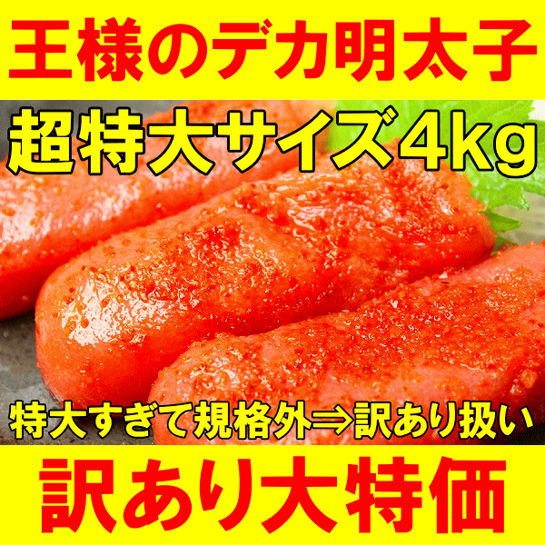 お中元ギフト・お歳暮ギフト・母の日ギフト・父の日ギフト等にのしをお付け出来ます。 ▼明太子全商品はコチラ! ▼訳あり全商品はコチラ! 商品名 特大辛子明太子・切れ子【訳アリ】【訳あり】 原産地/製造地 アメリカ産 内容量 4kg(2kg×2箱) 原材料 すけとうだらの卵(アメリカ産)、発酵調味料、食塩、酒、鰹節エキス、唐辛子、香辛料、調味料(アミノ酸等)、ソルビトール、ナイアシン、酸化防止剤(V.C.)、香辛料抽出物、甘味料(ステビア、甘草)、着色料(赤102、黄5、黄4)、発色剤(亜硝酸Na)、(原材料の一部に小麦、さばを含む) 賞味期限 パッケージに記載 保存方法 要冷凍?18℃以下で保存。再冷凍はお避け下さい。 注意事項 ●こちらの商品は訳あり商品となります。 ●解凍後は早めにお召し上がり下さい。 ●産地・パッケージ等は予告なく変更する場合がございます。品質・グレードは変わりありません。 詳細説明 安いだけの明太子に飽きた方へ!大きすぎて訳あり! ●訳あり明太子とは? 辛子明太子は製造時にどうしても薄皮が敗れてしまうことがあります。そんな型崩れしたもの、形が不揃いなものを<訳あり品>と呼びます。 もちろん皮が切れているだけで、味は1本物の贈答品と同じです! 今回ご用意した明太子大きすぎて規格外の為に【訳あり扱い】になってしまったんです! 味付けは素材を生かし、上品でありながらピリッとした辛さも効いています!毎日食べても飽きないバランス★ 様々な料理にもお使い頂けます。【楽天市場 魚介類・シーフード>明太子ランキング1位】 2014年9月29日(月)更新 (集計日:9月29日 16:12)リアルタイムランキング1位 粒立ち明太子をたっぷりと! たっぷりご家庭でご堪能下さい。 バターで和えて明太子パスタも! 豪快に、贅沢に使って下さい♪ 様々な明太子料理レシピで、 美味しくお楽しみ頂けます。 こんなに沢山お料理出来ました♪ 手軽に使える便利な本格派の明太子。 毎日の様に食べても飽きない上品な味付けです。 <よくあるご質問> Q:美味しく食べるのはどのように解凍すれば良いですか? A:冷凍庫から冷蔵庫へ移して、ゆっくりと解凍して下さい。 低温でゆっくりと解凍することで細胞が壊れず、ドリップ(水分)が出にくくなります。 ご家庭の冷蔵庫にもよりますが、半日程でお召し上がり頂ける状態になります。 Q:明太子に緑色の部分がありました、これは何ですか?不良品ですか? A:これはスケトウダラが捕らえられた時に内臓(胆嚢)が破裂し潰れて、 胆汁と呼ばれるものが卵巣の先、卵の上部に付着して色が付いたものです。 明太子が腐ったり、痛んでいるのではありませんので大丈夫です。 まれに訳あり明太子にはこういった部分も含まれている場合があります。 ※気になる方はお手数ですが取り除いてからお召し上がり下さい。 ▼業務用パッケージでお届けします▼