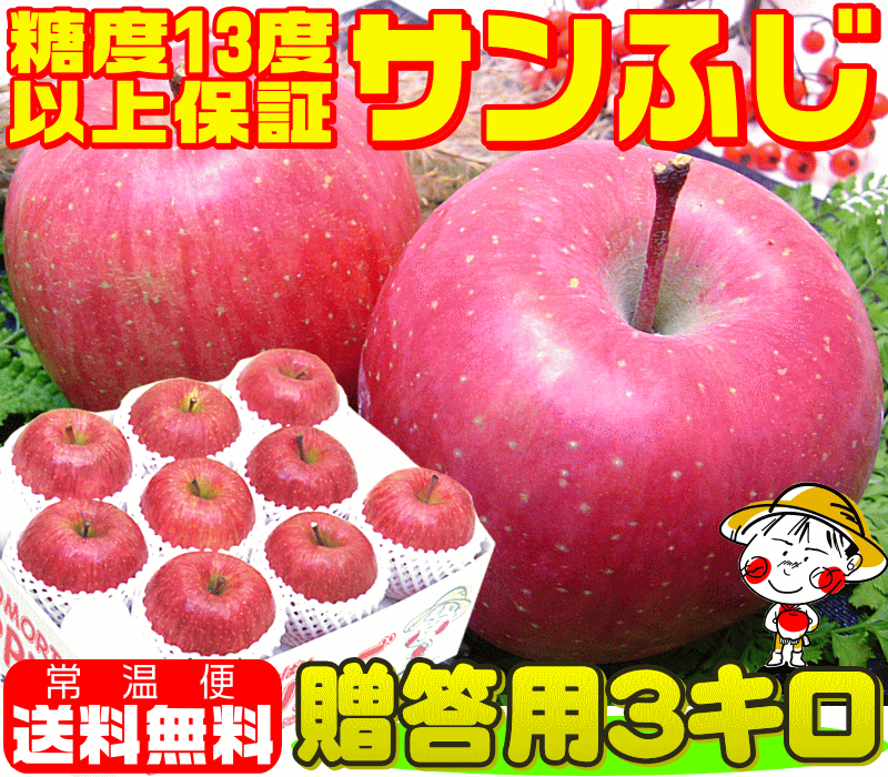 ギフト対応 お届け時間指定もできます。お届け時間指定の場合は、ご購入ステップの途 中で指定できますので安心してご利用してね(^o^)/ こちらの糖度13度保証ジューシーサンふじ贈答用3キロは、ダンボール1 段詰めで、約8〜10個の入り数となっております。 贈答用とは、光センサー選果機で内部品質合格と糖度13度以上を保証され たりんごを、更に熟練スタッフが表面にキズなどが無い贈答用規格の選果基 準に合格したりんごだけを選んだ、粒選びのりんごとなります。 箱詰めの際は、一個一個をネットで丁寧に包んでおり、内部品質を合格し、 糖度13度以上を保証しておりますので、安心して大切な方へお届けできま すよ。(^^♪ サンふじは青森県が全国に誇れる有名なりんごです。甘みと酸味のバランス に優れ、果汁が豊富でとってもジューシィ。シャキシャキの歯ごたえも魅力 的で、冷蔵庫に冷やしたサンふじをお召し上がりになりますと、冷たく、甘 い果汁がお口の中に広がりますよ。(^^♪ りんごの品質保持期限は商品到着後、約2週間です。 りんごの上手な保存方法はこちらをクリックしてね!