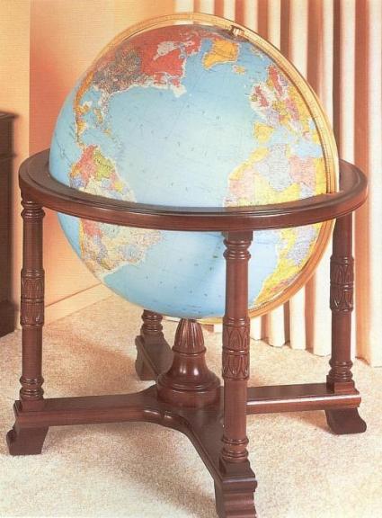 ○球径−81cm 高さ−121cm 重量−68kg 照明付 この古今東西を通じ最も詳細な地球儀は、国家首脳、政府高官、会社重役、大学、図書館はもとより、 社会のあらゆる領域で活躍される方々のその地位にふさわしい所有物の一つに数えられています。 常に改訂されている最新の球は円周約2.5m、表面積は2m2を超え、記載地名約21,000の詳細な地図は10色のオフセット印刷です。 揺籠式の架台は熟練した職人が彫刻し磨き上げて光沢を抑えた良質のマホガニー材で、真ちゅうの子午環には緯度目盛りが深く刻まれ、美しさをさらに強調しています。 細部に至るまで惜しみ無い配慮がほどこされ、芸術性と機能性が見事に調和している地球儀の最高傑作です。梱包は球と架台の二個口になります。